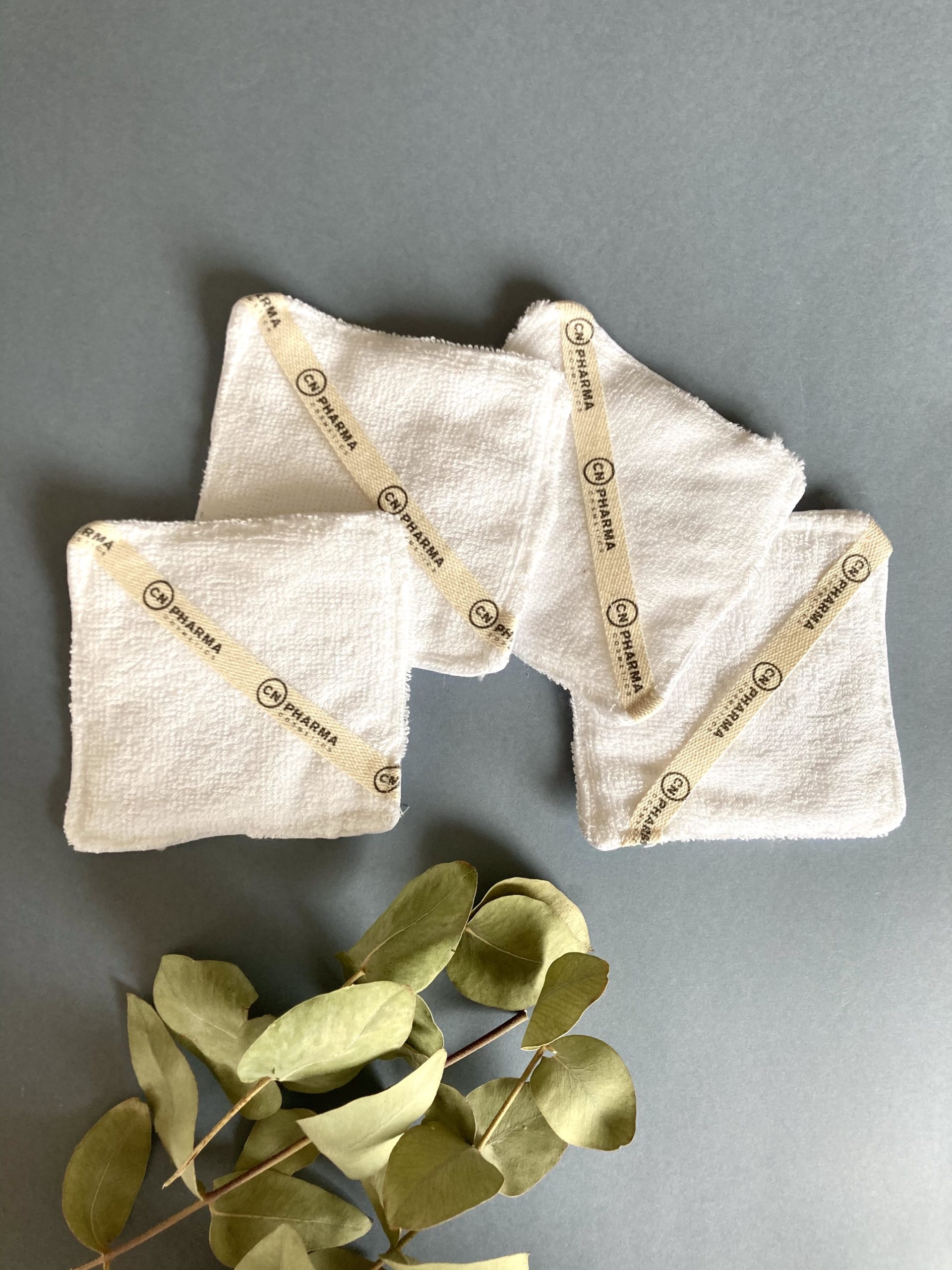 Pack de 4 toallitas desmaquillantes reutilizables. Por un lado, su textura de toalla te ayuda a eliminar maquillaje e impurezas y por otro, más suave, para zonas más sensibles. Además contiene una tira de tela que te resultará muy práctica.